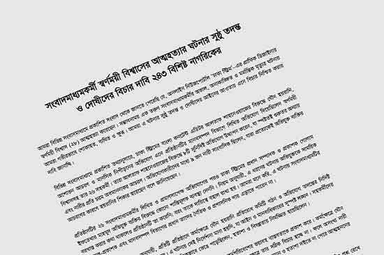 রাজধানীতে নারী গণমাধ্যমকর্মীর আত্মহত্যার ঘটনায় উদ্বেগ জানিয়ে বিবৃতি দিয়েছেন দেশের ২৪৩ জন বিশিষ্ট নাগরিক। এ ঘটনার সুষ্ঠু তদন্ত ও দোষীদের বিচার নিশ্চিত করার দাবি জানিয়েছেন তারা। বিবৃতিদাতারা বলেছেন, এমন ঘটনা বাংলাদেশের নারী কর্মীদের কর্মপরিবেশের ভয়াবহ বাস্তবতাকে সামনে নিয়ে এসেছে।