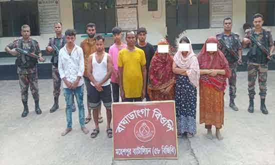 অপরদিকে, গত বৃহস্পতিবার রাতে বাঘাডাঙ্গা বিওপির দায়িত্বপূর্ণ এলাকায় সীমান্ত ৬০/৪৩-আর সংলগ্ন স্থান থেকে সুবেদার আতিয়ার রহমানের নেতৃত্বে নিয়মিত টহলের সময় অবৈধভাবে ভারত গমনকালে এক নারী ও এক শিশুকে আটক করা হয়। পরে গতকাল শুক্রবার সকাল ৯টার দিকে একই এলাকার সীমান্ত ৬০/৩৭-আর সংলগ্ন স্থান থেকে অবৈধভাবে ভারত প্রবেশের সময় আরও ৯ বাংলাদেশি নাগরিককে আটক করে বিজিবি। আটক ব্যক্তিদের মধ্যে রয়েছেন জাহাংগীর আলম (৪৩ পাবনা), আশিক মিয়া (২৪ নেত্রকোনা), ইয়াসিন শেখ (২৬ নড়াইল), অরিন্দম মজুমদার (১৮, গোপালগঞ্জ), হৃত্তিক পাত্র (১৮মাগুরা) ও জাহিদ ইকবাল ফিরোজ (২৫ঝিনাইদহ)। আটক সকলকে মহেশপুর থানায় হস্তান্তর করা হয়েছে বলে জানিয়েছে বিজিবি।