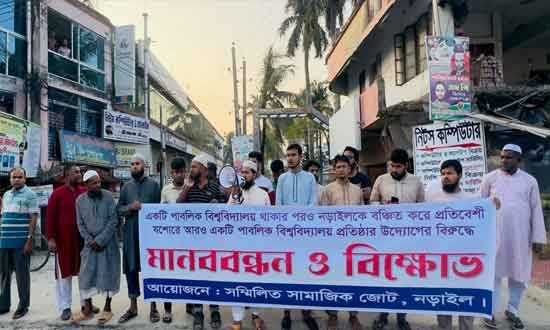নড়াইল জেলায় পাবলিক বিশ্ববিদ্যালয় ও মেডিকেল কলেজ প্রতিষ্ঠার দাবিতে হরতাল-অবরোধের মতো কর্মসূচির ঘোষণা দিয়েছেন বিভিন্ন পেশার মানুষসহ সামাজিক সংগঠনগুলো। নড়াইল প্রেসক্লাবের সামনে গতকাল শুক্রবার বিকেলে সম্মিলিত সামাজিক জোটের ব্যানারে এই দাবিতে মানববন্ধন ও বিক্ষোভ কর্মসূচি অনুষ্ঠিত হয়।