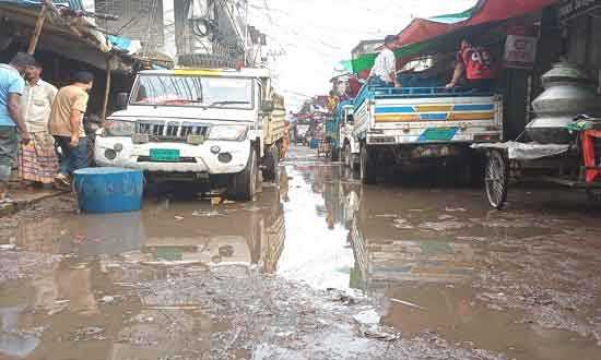 মাছ পরিবহনের পিক-আপ থেকে পানি পড়ে প্রধান সড়কে খানাখন্দের সৃষ্টি হয়েছে। ফলে শহরের শহীদ ডা. জিকরুল হক সড়ক চলাচল অযোগ্য ও বেহাল হয়ে পড়েছে।
