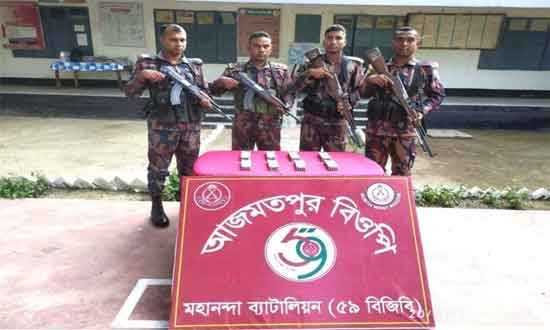 চাঁপাইনবাবগঞ্জের ভোলাহাট সীমান্তে মহানন্দা ব্যাটালিয়নের (৫৯ বিজিবি) সদস্যরা ৩১৯০ পিস টেনসিউইন ট্যাবলেট উদ্ধার করেছে। গত শনিবার গভীর রাতে আখ ক্ষেতে এ অভিযান চালায় চাঁনশিকারী বিওপি সদস্যরা। ৫৯ বিজিবি জানায়, গোপন সংবাদের ভিত্তিতে জানতে পারে অভিযানস্থলে বিপুল পরিমাণ নেশাজাতীয় ট্যাবলেট মজুদ রয়েছে এবং চোরাকারবারীরা সুযোগ বুঝে দেশের অভ্যন্তরে পাচার করবে। এ তথ্যের ভিত্তিতে চাঁনশিকারী বিওপি’র বিশেষ টহল দল শনিবার দিবাগত রাত সোয়া ১টার দিকে সীমান্ত পিলার ১৯৬/৫-এস হতে আনুমানিক ২০০ গজ বাংলাদেশের অভ্যন্তরে ভোলাহাট উপজেলার চামুচা গ্রামস্থ একটি আখ ক্ষেতে পরিচালনা করে এবং আখক্ষেতে তল্লাশী চালিয়ে একটি প্লাস্টিকের বস্তায় মোড়ানো অবস্থায় থাকা ৩১৯০ পিস ভারতীয় নেশাজাতীয় টেনসিউইন ট্যাবলেট উদ্ধার করে। উদ্ধারকৃত ট্যাবলেটগুলো সাধারণ ডায়েরীর মাধ্যমে ভোলাহাট থানায় হস্তান্তর করা হয়েছে। এ বিষয়ে মহানন্দা ব্যাটালিয়ন (৫৯ বিজিবি) এর অধিনায়ক লেঃ কর্নেল গোলাম কিবরিয়া বলেন, মাদকসহ সকল ধরনের চোরাচালানের বিরুদ্ধে জিরো টলারেন্স নীতি বান্তায়নের লক্ষ্যে বিজিবি’র কার্যক্রম চলমান রয়েছে, যা ভবিষ্যতেও অব্যাহত থাকবে।