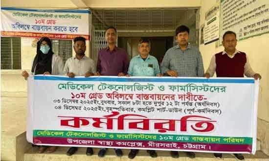 মেডিকেল টেকনোলজিস্ট ও ফার্মাসিস্টদের ১০ম গ্রেড বাস্তবায়নের দাবিতে কেন্দ্রীয় কমিটি ঘোষিত কর্মসূচির অংশ হিসেবে সারাদেশের মতো চট্টগ্রামের মীরসরাই উপজেলা স্বাস্থ্য কমপ্লেক্সেও অর্ধদিবস কর্মবিরতি পালিত হয়েছে। বুধবার সকাল ৮টা থেকে দুপুর ১২টা পর্যন্ত শান্তিপূর্ণভাবে এ কর্মসূচি পালন করেন মেডিকেল টেকনোলজিস্ট (ল্যাব) আব্দুল মান্নান, মেডিকেল টেকনোলজিস্ট (ডেন্টাল) উত্তম কুমার সরকার, ফার্মাসিস্ট ফটিক রায়, মেডিকেল টেকনোলজিস্ট দেলশাদ মিয়া, মেডিকেল টেকনোলজিস্ট তানিয়া আক্তার, মেডিকেল টেকনোলজিস্ট (ইপিআই) মোঃ কবির হোসেনসহ স্বাস্থ্যসেবার গুরুত্বপূর্ণ এই পেশাজীবীরা।