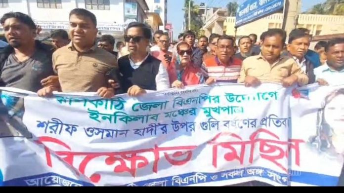 ইনকিলাব মঞ্চের আহ্বায়ক শরীফ ওসমান হাদির ওপর গুলির ঘটনার প্রতিবাদে ঝালকাঠিতে বিক্ষোভ মিছিল ও সমাবেশ করেছে বিএনপি। এ সময় মিছিলের শুরুতে সামনে থাকা নিয়ে নেতাকর্মীদের মধ্যে হট্টগোলের ঘটনাও ঘটে।