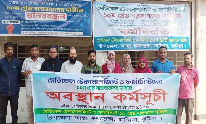 কুমিল্লার চান্দিনায় ১০ম গ্রেড বাস্তবায়নের দাবিতে মেডিকেল টেকনোলজিস্ট ও ফার্মাসিস্টদের অবস্থান কর্মসূচি পালন করা হয়। বুধবার, (১৭ ডিসেম্বর ২০২৫) সকাল ৮ টা থেকে ১১ টা পর্যন্ত ৩ ঘন্টা উপজেলা স্বাস্থ্য কমপ্লেক্সের সামনে মেডিকেল টেকনোলজিস্ট ও ফার্মাসিস্ট ১০ম গ্রেড বাস্তবায়ন পরিষদের কেন্দ্রীয় কর্মসূচির অংশ হিসেবে অবস্থান করে তারা। এর আগে চান্দিনা উপজেলা নির্বাহী অফিসার, চান্দিনা উপজেলা স্বাস্থ্য ও পরিবার কল্পনা কর্মকর্তা এবং উপজেলা পরিবার পরিকল্পনা কর্মকর্তা বরাবর স্মারক লিপি প্রদান করে তারা। আন্দোলন চলাকালে হাসপাতালে চিকিৎসা নিতে আসা রোগীদের চিকিৎসা সেবা ব্যাহত হয়।