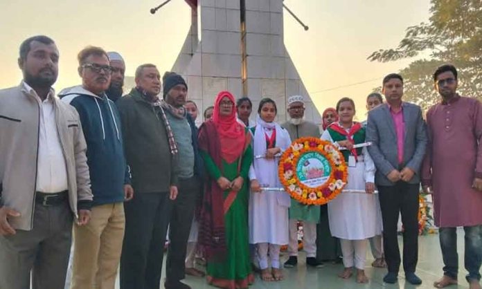 ময়মনসিংহের গৌরীপুরে যুগান্তর স্বজন সমাবেশের উদ্যোগে মহান বিজয় দিবস উপলক্ষ্যে মঙ্গলবার (১৬ ডিসেম্বর/২০২৫) ৫৪তম বিজয় উৎসবের শুরুতেই ৫৪টি জাতীয় পতাকা মিছিল বিজয় উৎসবের শোভাযাত্রা, শহিদদের প্রতি শ্রদ্ধা নিবেদনের জন্য বিজয়’৭১ বেদিতে স্বজনরা পুষ্পমাল্য অর্পণ, সাংস্কৃতিক অনুষ্ঠান ও আলোচনা সভার আয়োজন করে। আলোচনা অনুষ্ঠানে উপজেলা স্বজন সমাবেশের সভাপতি মো. এমদাদুল হক সভাপতিত্ব করেন। অনুষ্ঠান সঞ্চালনা করেন সাধারণ সম্পাদক সেলিম আল রাজ। বক্তব্য ভুটিয়ারকোনা স্কুল এন্ড কলেজের অধ্যক্ষ গোলাম মোহাম্মদ, গৌরীপুর ইসলামাবাদ ফাজিল মাদরাসার সহকারী অধ্যাপক মাহবুব আহমেদ, সহকারী শিক্ষক মো. ইয়াহিয়া, ইদ্রিস আলী, গৌরীপুর গণপাঠাগারের নির্বাহী পরিচালক আমিরুল মোমেনীন, ময়মনসিংহ উত্তর জেলা ছাত্রদলের যুগ্ম সম্পাদক জাহাঙ্গীর আলম পাপ্পু, জুলাইযোদ্ধা বাহালুল মুনশী, গৌরীপুর মহিলা পরিষদের সভাপতি নাদিরা জামান পান্না, সাধারণ সম্পাদক মমতাজ বেগম, প্রাথমিক বিদ্যালয় সহকারী শিক্ষক সমিতির সাধারণ সম্পাদক মো. কামাল হোসেন, যুগ্ম সম্পাদক ফারুকুল ইসলাম, সুজন সরকার, উপজেলা স্বজন সমাবেশের সহসভাপতি শামীমা খানম মীনা, আব্দুল মান্নান প্রমুখ।