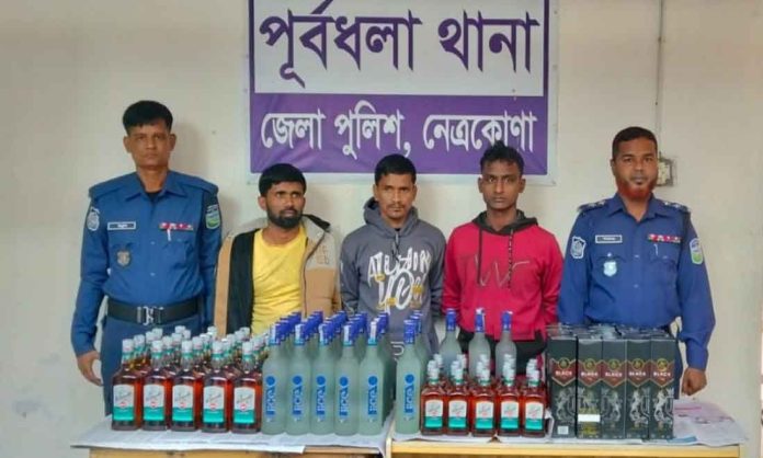 নেত্রকোনার পূর্বধলার চেকপোস্টে তল্লাশি চালিয়ে আমদানি নিষিদ্ধ ১০২ বোতল ভারতীয় মদসহ ৩ জনকে গ্রেপ্তার করেছে পূর্বধলা থানার পুলিশ। সোমবার, (২২ ডিসেম্বর ২০২৫) সকালে দুর্গাপুর–শ্যামগঞ্জ সড়কে লাল মিয়া বাজার শ্রমিক অফিসের সামনে চেকপোস্ট বসিয়ে তাদের আটক করা হয়।