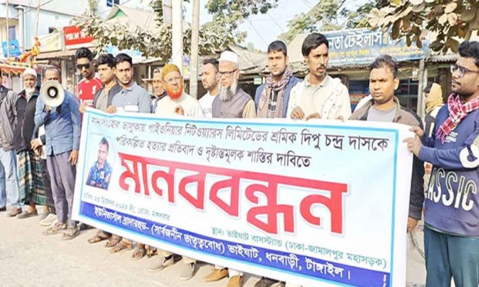 ময়মনসিংহের ভালুকায় পাইওনিয়ার নীটওয়্যারস লিমিটেডের শ্রমিক দিপু, ইনকিলাব মঞ্চের মুখপাত্র ওসমান হাদি সহ সারাদেশে সকল হত্যা কান্ডের প্রতিবাদ ও বিচারের দাবীতে টাঙ্গাইলের ধনবাড়ীর ভাইঘাটে মানববন্ধন অনুষ্ঠিত হয়েছে। গতকাল মঙ্গলবার বিকেলে টাঙ্গাইলের ধনবাড়ী উপজেলার ভাইঘাট বাসস্ট্যান্ড এলাকায় স্থানীয় ইউনিভার্সাল ব্রাদারহুড( সার্বজনীন ভাতৃত্ববোধ) সংগঠনের ব্যানারে এ মানববন্ধন অনুষ্ঠিত হয়। এতে পাইওনিয়ার নীটওয়্যারস লিমিটেডের শ্রমিক, স্থানীয় সচেতন নাগরিক ও বিভিন্ন শ্রেণি-পেশার মানুষ অংশগ্রহণ করেন। মানবন্ধনে বক্তব্য দেন, ভাইঘাট সূত্রধরপাড়া পূজামন্ডপের সভাপতি পরেশ সূত্রধর, ছাত্র দীপু সূত্রধর, টাঙ্গাইল জেলা ছাত্র অধিকারের সহ সভাপতি মাহমুদুল হাসান মিলন, স্থানীয় হিন্দু নেতা ভোজন সূত্রধর, আনন্দ সূত্রধর, পরেশ রায়, বাংলাদেশ জামায়াতে ইসলামী যুব বিভাগ ধনবাড়ী উপজেলা শাখার সভাপতি মিনহাজ উদ্দিন, মধুপুর উপজেলা প্রেসক্লাবের সহ সভাপতি সাংবাদিক আব্দুল জলিল, মাওলানা আমিনুল ইসলাম মারুফী, ধনবাড়ী প্রেসক্লাবের সাধারণ সম্পাদক সাংবাদিক হাফিজুর রহমানসহ অন্যান্যরা।মানববন্ধনে বক্তারা বলেন, শ্রমিক দিপুকে পূর্বপরিকল্পিতভাবে হত্যা করা হয়েছে। দ্রুত সময়ের মধ্যে দিপু ও ইনকিলাব মঞ্চের মুখপাত্র ওসমান হাদি সহ সারাদেশে সকল হত্যা কান্ডের ঘটনার সুষ্ঠু তদন্ত করে প্রকৃত হত্যাকারীদের শনাক্ত ও দৃষ্টান্তমূলক শাস্তি নিশ্চিত করতে হবে। অন্যথায় কঠোর আন্দোলনের কর্মসূচি ঘোষণা করা হবে বলে হুঁশিয়ারি দেন তারা।