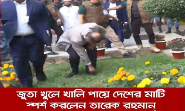 বিএনপির মিডিয়া সেল থেকে সম্প্রচার করা একটি লাইভ ভিডিওতে দেখা যায়, বিমানবন্দরের দরজা দিয়ে বেরিয়ে তিনি খোলা একটি অংশে দাঁড়ান। সেখানে ঝুঁকে মাটি ছুঁয়ে দেখেন তিনি। পরে জুতা খুলে কিছুক্ষণ খালি পায়ে দাঁড়ান সেখানে।