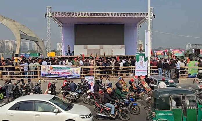 তারেক রহমানকে স্বাগত জানাতে ঢাকার ৩০০ ফিটের সংবর্ধনাস্থলে জমায়েত হয়েছেন বিপুল সংখ্যক বিএনপি নেতা-কর্মী।