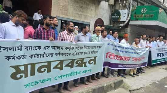 তিনি বলেন, ‘‘এস আলম নিজ বাড়ি ও হাটে বাজারে বক্স বসিয়ে কোনো প্রকার নিয়ম নীতি না মেনে অবৈধভাবে চাকরি দিয়েছে। তাদের বাতিল করতে হবে। তাদের কারণে ইসলামী ব্যাংক এখন খারাপ দশায়। সেবার মান কমে গেছে। আমরা চাই যাদের কারণে ব্যাংকের এই জীর্নহাল তারা চলে যাক।”