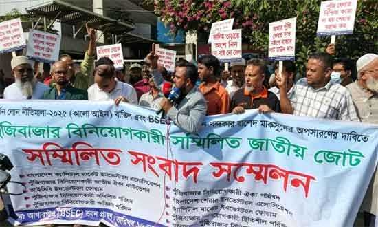 রোববার,(১৬ নভেম্বর ২০২৫) দুপুরে রাজধানীর আগারগাঁওয়ে বিএসইসির কার্যালয়ের সামনে থেকে বিক্ষোভ ও মানববন্ধন কর্মসূচি থেকে এই দাবি জানান বিনিয়োগকারীদের নতুন এই জোট। এসময় তারা বিএসইসির চেয়ারম্যানের অপসারণের দাবিতে বিভিন্ন স্লোগান দেন।