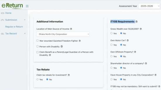 এনবিআর আরও জানায়, কেউ অনলাইনে রিটার্ন দাখিলে অসমর্থ হলে তিনি ১৫ ডিসেম্বর পর্যন্ত উপকর কমিশনারের নিকট আবেদন করার সুযোগ পাবেন। চলতি করবর্ষে অনলাইনে রিটার্ন দাখিল বাধ্যতামূলক করা হয়েছে। তবে ৬৫ বছর বা তদূর্ধ্ব বয়সী, শারীরিকভাবে অসমর্থ বা বিশেষ চাহিদা সম্পন্ন ব্যক্তি, বিদেশে অবস্থানরত বাংলাদেশি, মৃত করদাতার পক্ষে আইনগত প্রতিনিধি এবং বাংলাদেশে কর্মরত বিদেশি নাগরিকদের জন্য এই বাধ্যবাধকতা শিথিল রাখা হয়েছে। চাইলে তারাও ই-রিটার্ন দাখিল করতে পারবেন।