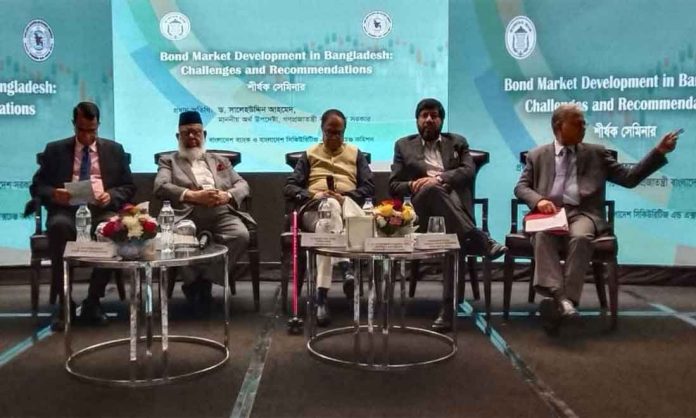 তিনি বলেন, ‘উচ্চ মূল্যস্ফীতি এবং ব্যাংক ঋণের ১৬ শতাংশ সুদহার বন্ড মার্কেটের উন্নয়নে ‘সবচেয়ে বড় চ্যালেঞ্জ’। বন্ড মার্কেটকে শক্তিশালী করতে হলে সামষ্টিক অর্থনীতিকে স্থিতিশীল করতে হবে। মূল্যস্ফীতিকে নিয়ন্ত্রণ করতে হবে। ব্যাংকে ১৬ শতাংশ সুদ থাকলে বন্ড মার্কেট শক্তিশালী করা কঠিন।’