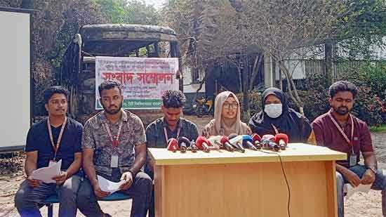 সংবাদ সম্মেলনে শিক্ষার্থীরা প্রশ্ন তোলেন, আমাদের ক্যাম্পাসে হামলার কি কোনো ইমার্জেন্সি অবস্থা ছিল? একটি ইমার্জেন্সি অবস্থায় সাইরেনগুলো বাজানোর কথা এবং দুই আড়াই হাজার শিক্ষার্থীকে তারা কেনো আটকালেন না। দুই আড়াই হাজার শিক্ষার্থী আসতেছে কোনো বিভাগের কেউ আসলো না কোনো ফ্যাকাল্টি আসলো না। আমরা পুলিশের সঙ্গে বেশ কয়েক বার আমরা কথা বলেছি, পুলিশ আমাদেরকে বলেছে পুলিশ নাকি এখানে আছে। পরে আমরা সেনাবাহিনীকে ফোন দিয়েছি কিন্তু তারা আমাদেরকে জানিয়েছে তাদের এরিয়ার মধ্যে পড়ে না। আমাদের অর্ধশতাধিক শিক্ষার্থী হাসপাতালে রয়েছে। তার মধ্যে দুইজন শিক্ষার্থীর অবস্থা আশঙ্কাজনক। আমি সরকার ব্যবস্থার কাছে এবং সবার কাছে একটা দাবি চাইবো এই যে হামলা ন্যাক্কারজনক ঘটনা ঘটেছে তার সুষ্ঠ বিচার হোক।
