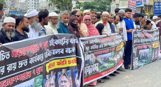 নারায়ণগঞ্জের বহুল আলোচিত সাত খুন মামলায় উচ্চ আদালতের দেয়া রায় দ্রুত কার্যকর করার দাবিতে মানববন্ধন করেছেন নিহতদের আত্মীয়-স্বজন ও এলাকাবাসী। শুক্রবার দুপুর ১২ টায় ঢাকা-চট্টগ্রাম মহাসড়কের সিদ্ধিরগঞ্জের মৌচাক এলাকায় এই মানববন্ধন অনুষ্ঠিত হয়। ঘন্টাব্যাপী এ মানববন্ধনে নিহত নারায়ণগঞ্জ সিটি কর্পোরেশনের প্যানের মেয়র ও কাউন্সিলর নজরুল ইসলামের স্ত্রী সেলিনা ইসলাম বিউটি, নজরুল ইসলামের বড় ভাই নূর মোহাম্মদ, ছোট ভাই আব্দুস সালাম, নিহত তাজুল ইসলামের বাবা আবুল খায়ের, ভাই রাজু আহমেদ ও নিহত গাড়ী চলক জাহাঙ্গীরের স্ত্রী নূপুরসহ স্থানীয় গণ্যমান্য ব্যক্তিবর্গসহ কয়েকশত এলাকাবাসী উপস্থিত ছিলেন।