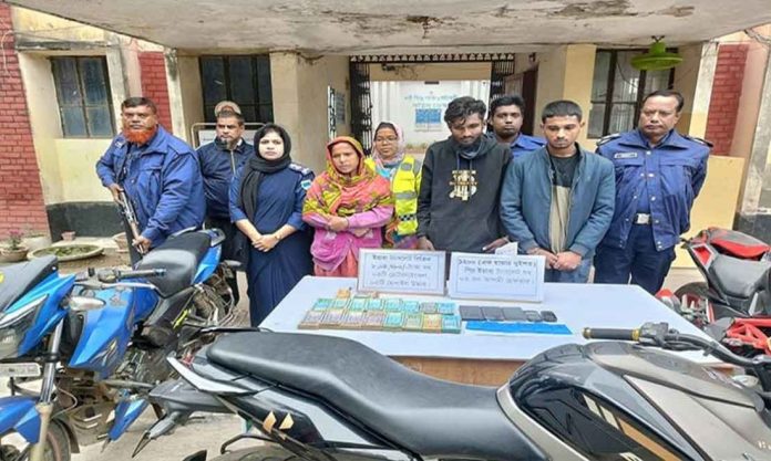 ঝিনাইদহের মহেশপুরে পুলিশের বিশেষ অভিযানে ১ হাজার ২০০ পিস ইয়াবা, নগদ ৮ লাখ ৪ হাজার ৮৭০ টাকা, তিনটি মোটরসাইকেল ও পাঁচটি মোবাইল ফোন উদ্ধারসহ তিনজনকে আটক করা হয়েছে। শনিবার,(২০ ডিসেম্বর ২০২৫) ভোরে উপজেলার যোগীহুদা গ্রামের কথিত মাদক কারবারি দেলোয়ার হোসেনের বাড়িতে এ অভিযান পরিচালিত হয়। অভিযানের সময় দেলোয়ার হোসেন পালিয়ে গেলেও তার স্ত্রী লাইলি বেগম (৩৭), ছেলে লিমন হাসান (২৩) এবং জলিলপুর গ্রামের মেহেদী হাসান জিসানকে আটক করে পুলিশ। গোপন সংবাদের ভিত্তিতে মহেশপুর থানার অফিসার ইনচার্জ (ওসি) মেহেদী হাসানের নেতৃত্বে পরিচালিত অভিযানে বাড়িটি ঘিরে পরিকল্পিতভাবে তল্লাশি চালানো হয়।