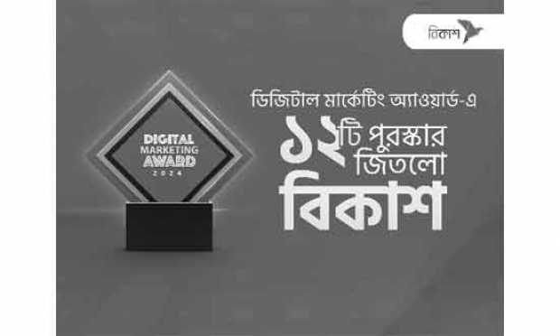 ‘ডিজিটাল মার্কেটিং অ্যাওয়ার্ড ২০২৪’-এ ১২টি পুরস্কার জিতে নিয়েছে মোবাইল আর্থিক সেবাদাতা প্রতিষ্ঠান বিকাশ। এর মাঝে বিকাশ সরাসরি পেয়েছে ৭টি পুরস্কার আর পার্টনার প্রতিষ্ঠানের মাধ্যমে পেয়েছে ৫টি পুরস্কার। এই পুরস্কারগুলোর মধ্যে ৩টি সিলভার এবং ৯টি ব্রোঞ্জ।