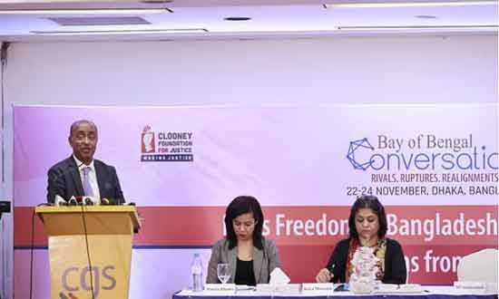 সেন্টার ফর গভর্ন্যান্স স্টাডিজ (সিজিএস) ঢাকার একটি হোটেলে ‘বে অব বেঙ্গল কনভারসেশন ২০২৫’ শীর্ষক এ সম্মেলনের আয়োজন করে। তিন দিনব্যাপী এ সম্মেলনের শেষ দিন আলোচনার বিষয়বস্তু ছিল ‘ডিজিটাল নিরাপত্তা আইন সম্পর্কিত প্রতিবেদন প্রকাশ: ভবিষ্যৎ বাংলাদেশের গণমাধ্যমের স্বাধীনতার জন্য গুরুত্বপূর্ণ শিক্ষা’। এতে বক্তব্য দেন রাষ্ট্রের প্রধান আইন কর্মকর্তা (অ্যাটর্নি জেনারেল) মো. আসাদুজ্জামান, সুপ্রিম কোর্টের জ্যেষ্ঠ আইনজীবী সারা হোসেন, ঢাকা বিশ্ববিদ্যালয়ের পিস অ্যান্ড কনফ্লিক্ট স্টাডিজ বিভাগের অধ্যাপক সাজ্জাদ সিদ্দিকী প্রমুখ।