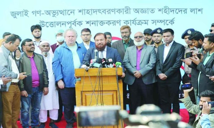 রোববার, (০৭ ডিসেম্বর ২০২৫) সকালে রায়ের বাজার কবরস্থানে ‘জুলাই গণঅভ্যুত্থানে শাহাদাতবরণকারী অজ্ঞাত শহীদদের লাশ উত্তোলনপূর্বক শনাক্তকরণ কার্যক্রম’ শীর্ষক সংবাদ সম্মেলনে তিনি এ কথা বলেন। দেহাবশেষ কবর থেকে তুলে ডিএনএ নমুনা সংগ্রহের জন্য রায়ের বাজার কবরস্থানেই একটি অস্থায়ী ফরেনসিক ল্যাব স্থাপন করা হয়েছে। ইতোমধ্যেই লাশ উত্তোলনের কাজ শুরু হয়েছে।