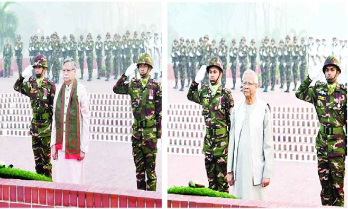মঙ্গলবার, সকাল ৬টা ৩৫ মিনিটে রাষ্ট্রপতি মো. সাহাবুদ্দিন সাভারের জাতীয় স্মৃতিসৌধে পুষ্পস্তবক অর্পণের মাধ্যমে একাত্তরের শহীদ মুক্তিযোদ্ধাদের প্রতি শ্রদ্ধা জানান। এরপর সকাল ৬টা ৫৬ মিনিটে প্রধান উপদেষ্টা মুহাম্মদ ইউনূস জাতীয় স্মৃতিসৌধে ফুল দিয়ে শ্রদ্ধা নিবেদন করেন।এ সময় তিন বাহিনীর একটি চৌকস দল রাষ্ট্রপতি ও প্রধান উপদেষ্টাকে রাষ্ট্রীয় স্যালুট প্রদান করে।পুষ্পস্তবক অর্পণের পর রাষ্ট্রপতি ও প্রধান উপদেষ্টা শহীদ বেদীর সামনে কিছুক্ষণ নীরবে দাঁড়িয়ে থাকেন।শ্রদ্ধা নিবেদন শেষে তারা স্মৃতিসৌধের পরিদর্শন বইয়ে সই করেন।