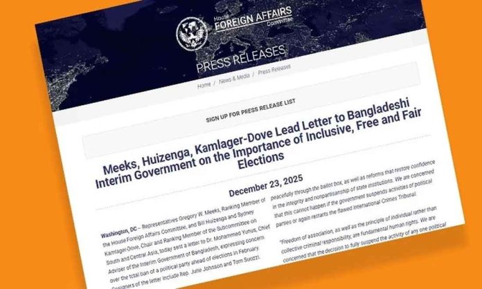 চিঠিতে প্রধান উপদেষ্টাকে মার্কিন আইনপ্রণেতারা লিখেছেন, ‘রাজনৈতিক সংকটের এ সময়টাতে রাজনৈতিক দলগুলোর সঙ্গে অন্তর্বর্তী সরকারের কাজ করাটা অত্যন্ত গুরুত্বপূর্ণ। কেননা এর মধ্য দিয়ে অবাধ ও সুষ্ঠু নির্বাচনের পরিবেশ তৈরি করা সম্ভব হবে। আর এটা ব্যালট বাক্সের মাধ্যমে শান্তিপূর্ণভাবে দেশের জনগণের মতামত প্রকাশে সহায়ক হবে। সেই সঙ্গে রাষ্ট্রীয় প্রতিষ্ঠানগুলোর সততা আর দলনিরপেক্ষতার প্রতি আস্থা ফেরাতে প্রয়োজনীয় সংস্কারেও ভূমিকা রাখবে। কিন্তু আমরা এটা নিয়ে উদ্বিগ্ন, সরকার যদি রাজনৈতিক দলগুলোর কার্যক্রম স্থগিত করে বা ত্রুটিপূর্ণ আন্তর্জাতিক অপরাধ ট্রাইব্যুনাল আবার চালু করে-তবে এসব করা যাবে না।’