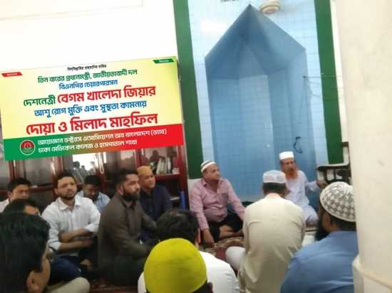 দোয়া মাহফিলে অংশগ্রহণকারীরা দেশনেত্রী খালেদা জিয়ার দীর্ঘায়ু ও সুস্থতা কামনা করেন।