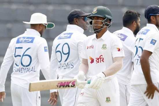 শ্রীলঙ্কা ১ম ইনিংস: ৬৮ ওভারে ২৮০ (কামিন্দু ১০২, ধনাঞ্জয়া ১০২, করুণারত্নে ১৭, কুশল মেন্ডিস ১৬; খালেদ ৩/৭২, রানা ৩/৮৭, তাইজুল ১/৩১, শরীফুল ১/৫৯)।