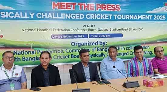 ক্রিকেট বোর্ডের (বিসিবি) ফিজিক্যাল চ্যালেঞ্জড ক্রিকেট উইংয়ের সহায়তায় যে প্রতিযোগিতার নাম ‘ফিজিক্যালি চ্যালেঞ্জড ক্রিকেট টুর্নামেন্ট’। বৃহস্পতিবার,(০৬ নভেম্বর ২০২৫) এক সংবাদ সম্মেলনে এসব তথ্য জানান এনপিসির মহাসচিব ড. মারুফ আহমেদ মৃদুল। জাতীয় ক্রিকেট দলের সাবেক অধিনায়ক ও এনপিসির ব্র্যান্ড অ্যাম্বাসেডর হাবিবুল বাশার, বিসিবির পরিচালক ও ফিজিক্যাল চ্যালেঞ্জড ক্রিকেট উইংয়ের চেয়ারম্যান জুলফিকার আলী খান, এনপিসির সহ-সভাপতি ও পুলিশের যুগ্ম কমিশনার নাসিরুল ইসলাম, এনপিসির যুগ্ম সম্পাদক ও সাবেক ক্রিকেটার সানোয়ার হোসেন উপস্থিত ছিলেন।