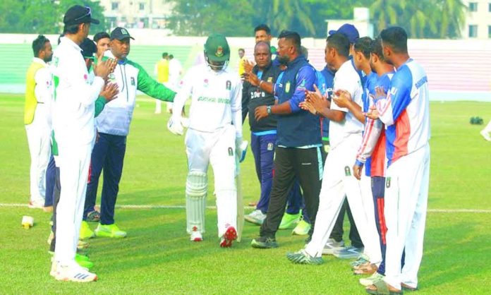 সোমবার তৃতীয় দিন ১৫৮ রানে গুটিয়ে ফলো-অনে পড়ে। সর্বোচ্চ ৪৩ রান করেন উইকেটরক্ষক ইরফান শুক্কুর। ঢাকার হয়ে রিপন মন্ডল, সুমন খান ও সালাউদ্দিন শাকিল ৩টি করে উইকেট নেন।